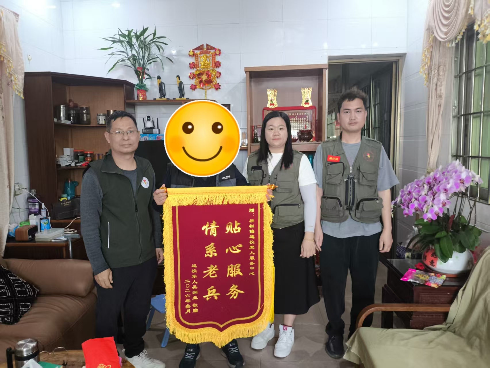 ▲新丰村退役军人吴叔赠送锦旗给横栏镇退役军人服务中心